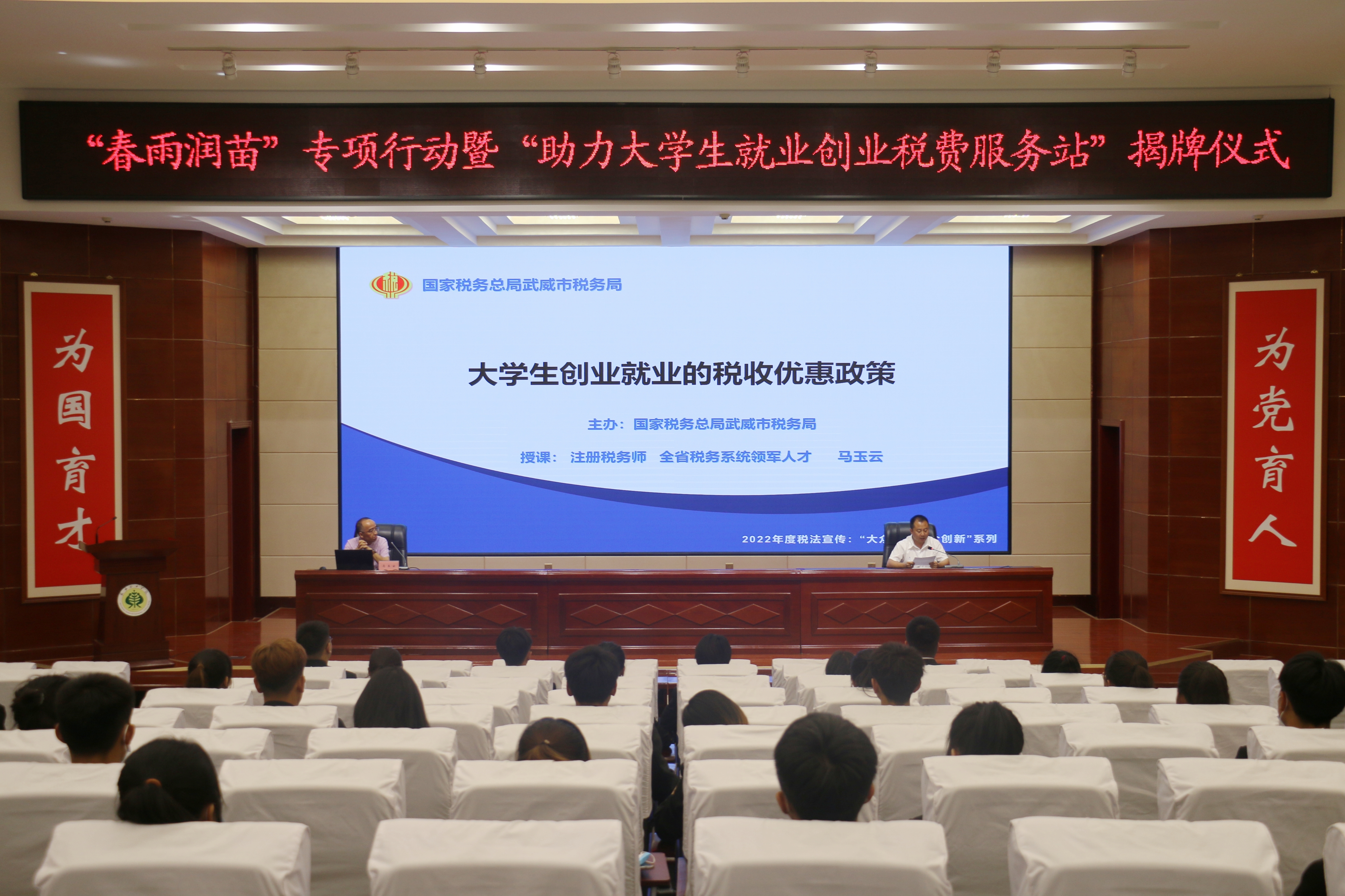 揭牌儀式結(jié)束后,武威市稅費(fèi)專家顧問團(tuán)隊(duì)代表馬玉云為學(xué)校師生帶來“就業(yè)創(chuàng)業(yè)稅費(fèi)第一課”的報(bào)告,向大學(xué)生們普及稅法知識,特別針對高校畢業(yè)生就業(yè)創(chuàng)業(yè)稅費(fèi)優(yōu)惠政策、組合式稅費(fèi)支持政策、個(gè)人所得稅政策以及社保繳納等內(nèi)容進(jìn)行了詳細(xì)解讀,為大學(xué)生創(chuàng)業(yè)就業(yè)新苗送上一場“及時(shí)雨”。