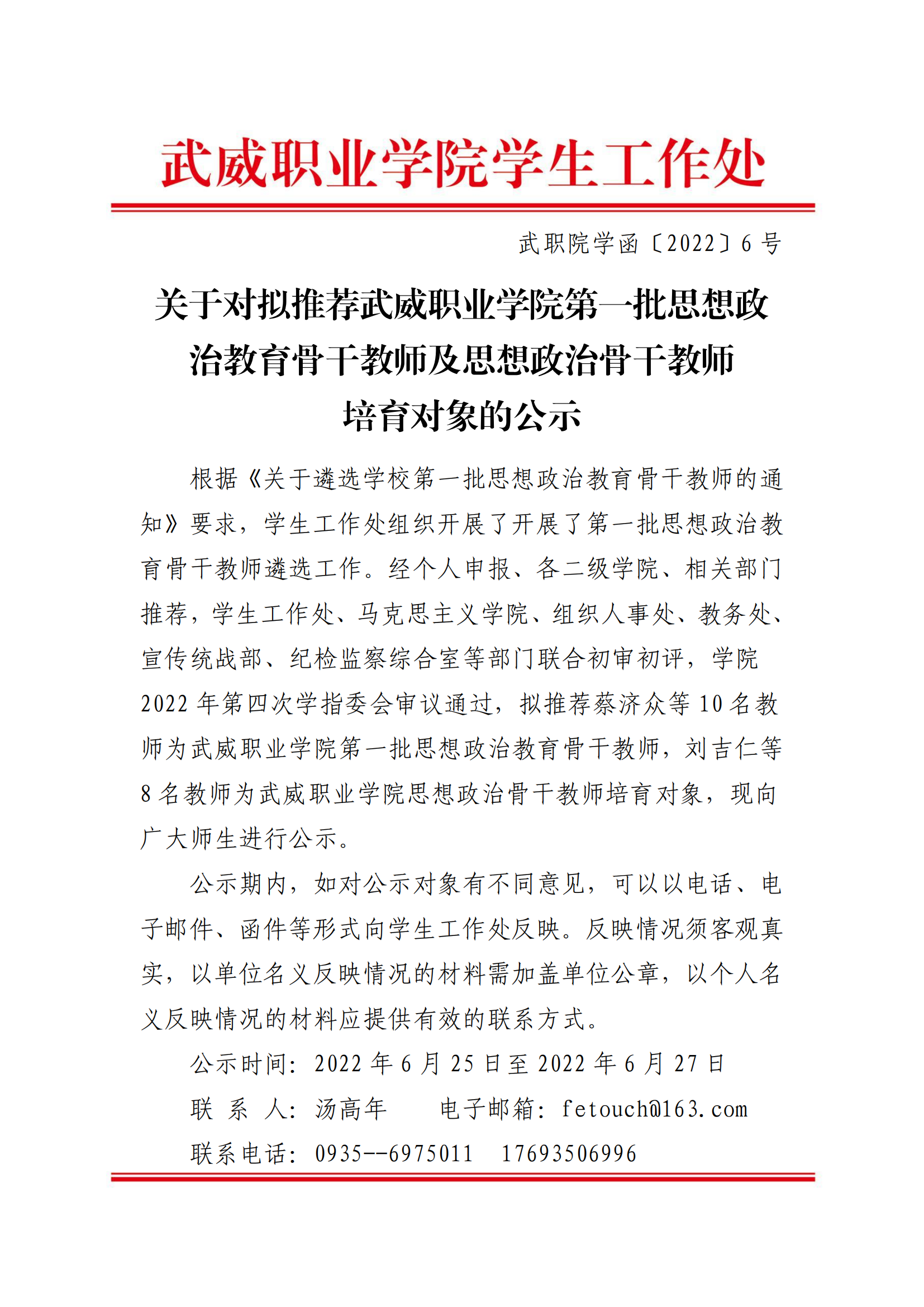 關(guān)于對擬推薦武威職業(yè)學(xué)院第一批思想政治教育骨干教師及思想政治骨干教師培育對象的公示