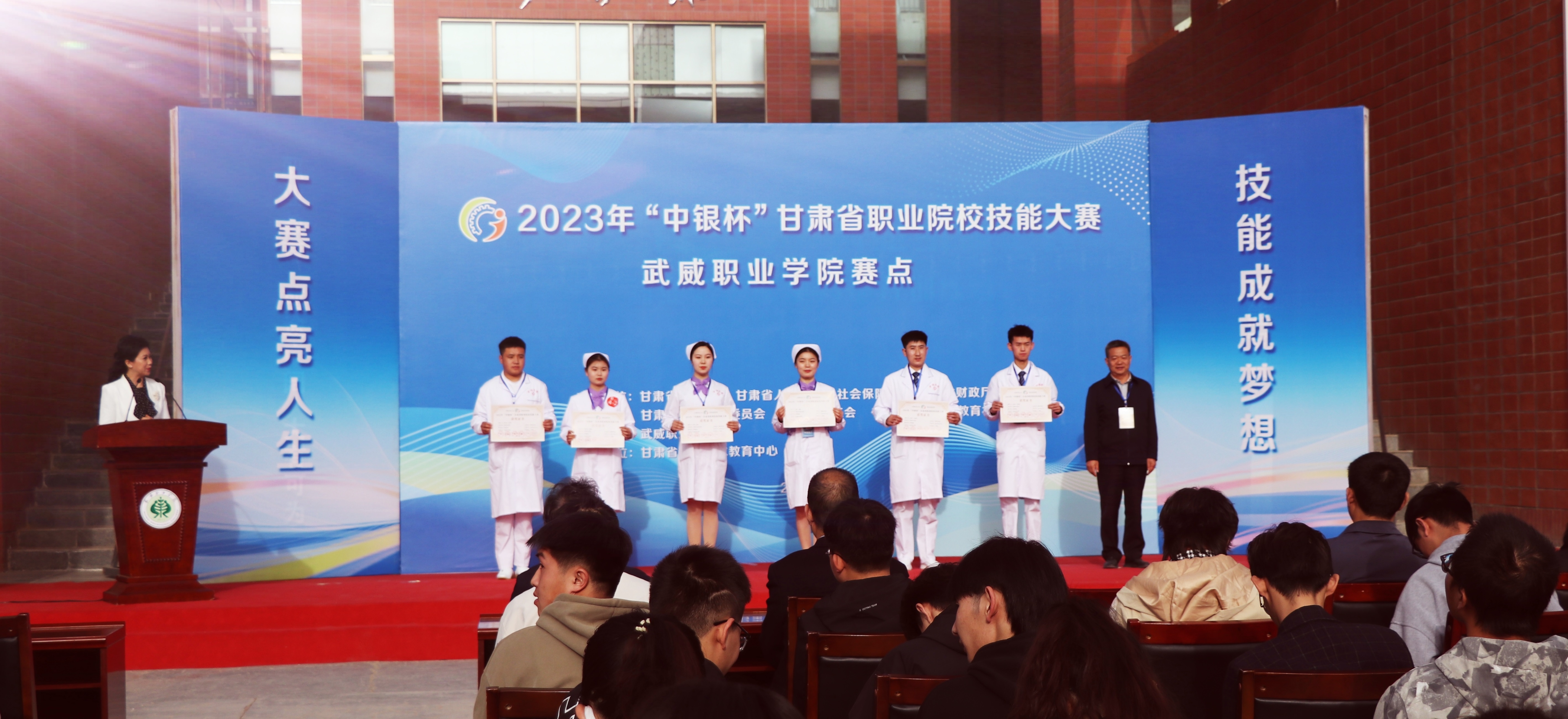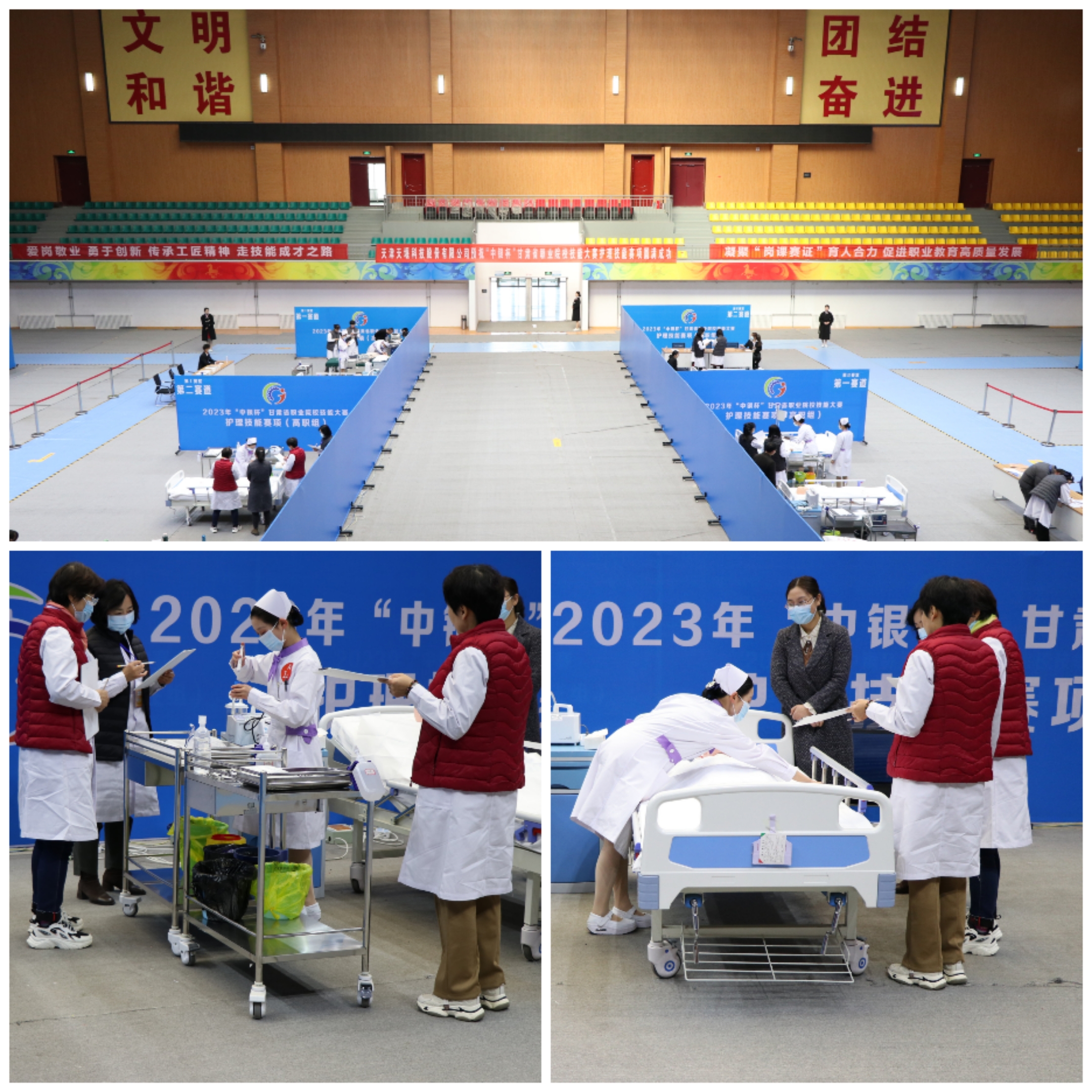 為全面貫徹落實省委辦公廳、省政府辦公廳《關(guān)于推動現(xiàn)代職業(yè)教育高質(zhì)量發(fā)展,加快“技能甘肅”建設(shè)的若干措施》,進一步推動打造“技能甘肅”工作,促進職業(yè)學校專業(yè)建設(shè)與教學改革,提高學生實踐動手能力和職業(yè)素養(yǎng),弘揚勞動光榮、技能寶貴、創(chuàng)造偉大的時代風尚,引領(lǐng)職業(yè)學校適應行業(yè)現(xiàn)狀及技術(shù)發(fā)展趨勢,檢驗教學成果,促進護理專業(yè)的教育教學改革。4月10日-4月12日,2023年“中銀杯”甘肅省職業(yè)院校技能大賽護理技能賽項在武威職業(yè)學院順利舉行。來自全省10所高職院校的25個團隊、50名學生和22名教師選手匯集武威職業(yè)學院賽場,共同譜寫護理人的工匠精神和大愛情懷。