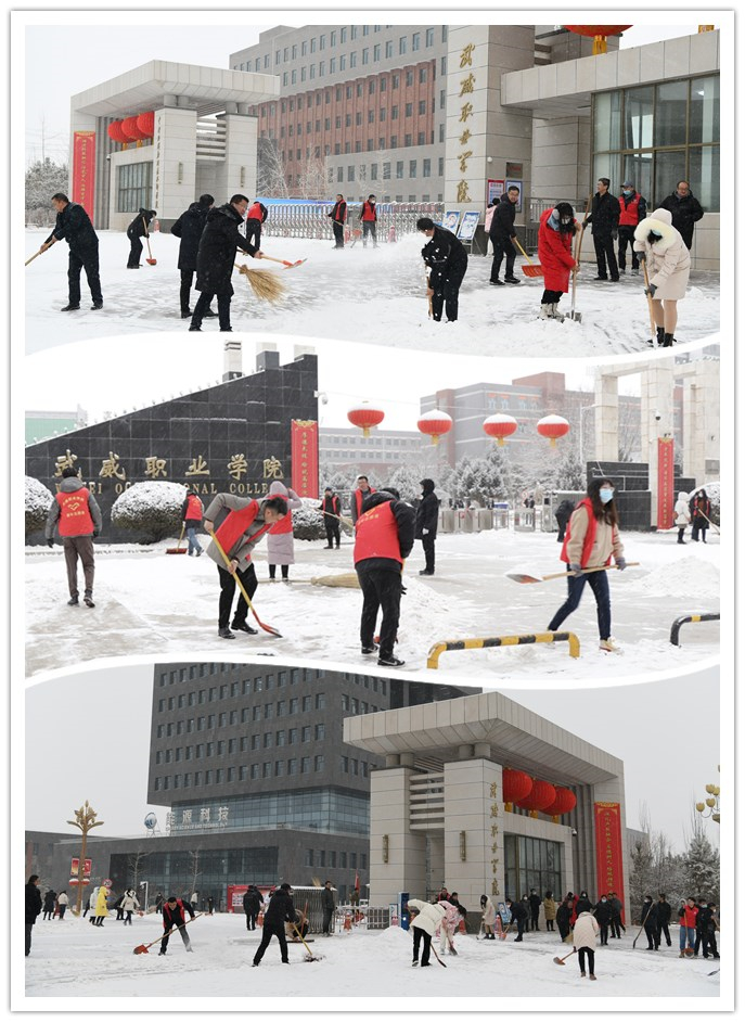 本次清掃積雪活動進一步提高了教職工的志愿服務意識,為建設優(yōu)美、整潔、舒適的校內外環(huán)境,建設美麗文明的武威貢獻了一份力量,帶動了更多的轄區(qū)居民以實際行動支持創(chuàng)城,從我做起,從身邊小事做起,從點滴做起,共同創(chuàng)建文明城市,爭做文明市民。
