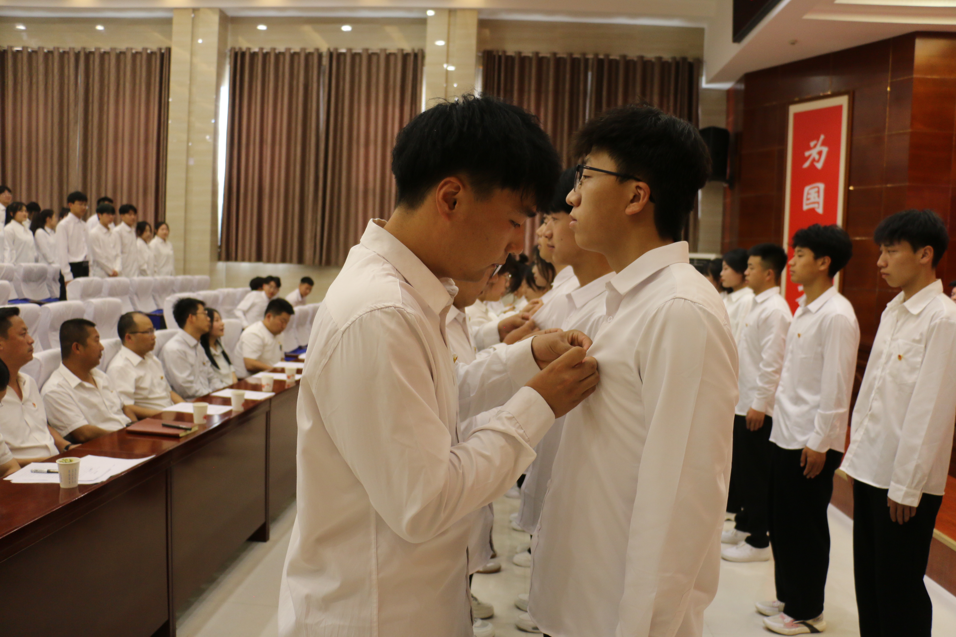 入團儀式上,校團委相關(guān)負(fù)責(zé)人宣讀了128名新團員名單,并向新團員闡釋了團徽的組成及象征意義。老團員代表為新團員代表佩戴了團徽,全體團員面對鮮艷的團旗,進(jìn)行了莊嚴(yán)的宣誓。