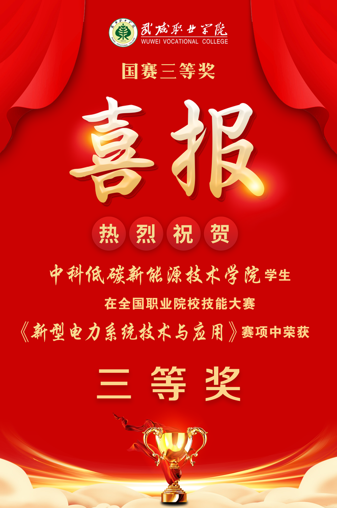 在2023年全國職業(yè)院校技能大賽中中科低碳新能源技術(shù)學(xué)院學(xué)生陳德平、徐浩芝、蘆紀(jì)維獲得高職組新型電力系統(tǒng)技術(shù)與應(yīng)用賽項團(tuán)體三等獎。