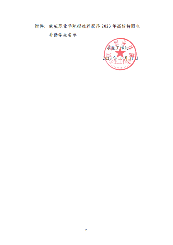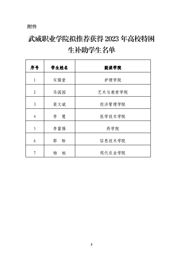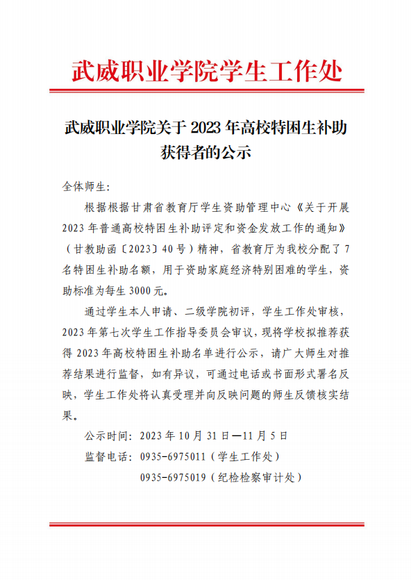 武威職業(yè)學(xué)院關(guān)于2023年高校特困生補(bǔ)助獲得者的公示