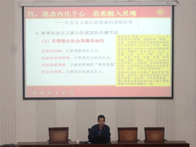 翟存祥從人民要有信仰國家才有力量、凝聚中國精神傳遞中國聲音、時代召喚理論理論助推時間、觀念內(nèi)化于心思想融入靈魂、精神外化于行夢想落地生根等五個方面入手,運(yùn)用哲學(xué)社會學(xué)、文化心理學(xué)、國學(xué)文化等學(xué)科領(lǐng)域上的獨特見解,將傳統(tǒng)文化和社會科學(xué)深度融合,對社會主義核心價值觀產(chǎn)生的時代背景、頂層設(shè)計、與核心價值體系的關(guān)系、系統(tǒng)培育、全面踐行等問題進(jìn)行了深入剖析,為全系師生擺脫生活困擾、消除不健康思維傾向、打造正確人生夢想、積極學(xué)習(xí)、努力工作、快樂生活鎖定了正確的思維方向,其生動的語言、精彩的論證、獨具特色的講座風(fēng)格,獲得了在場師生的熱烈歡迎和陣陣掌聲。