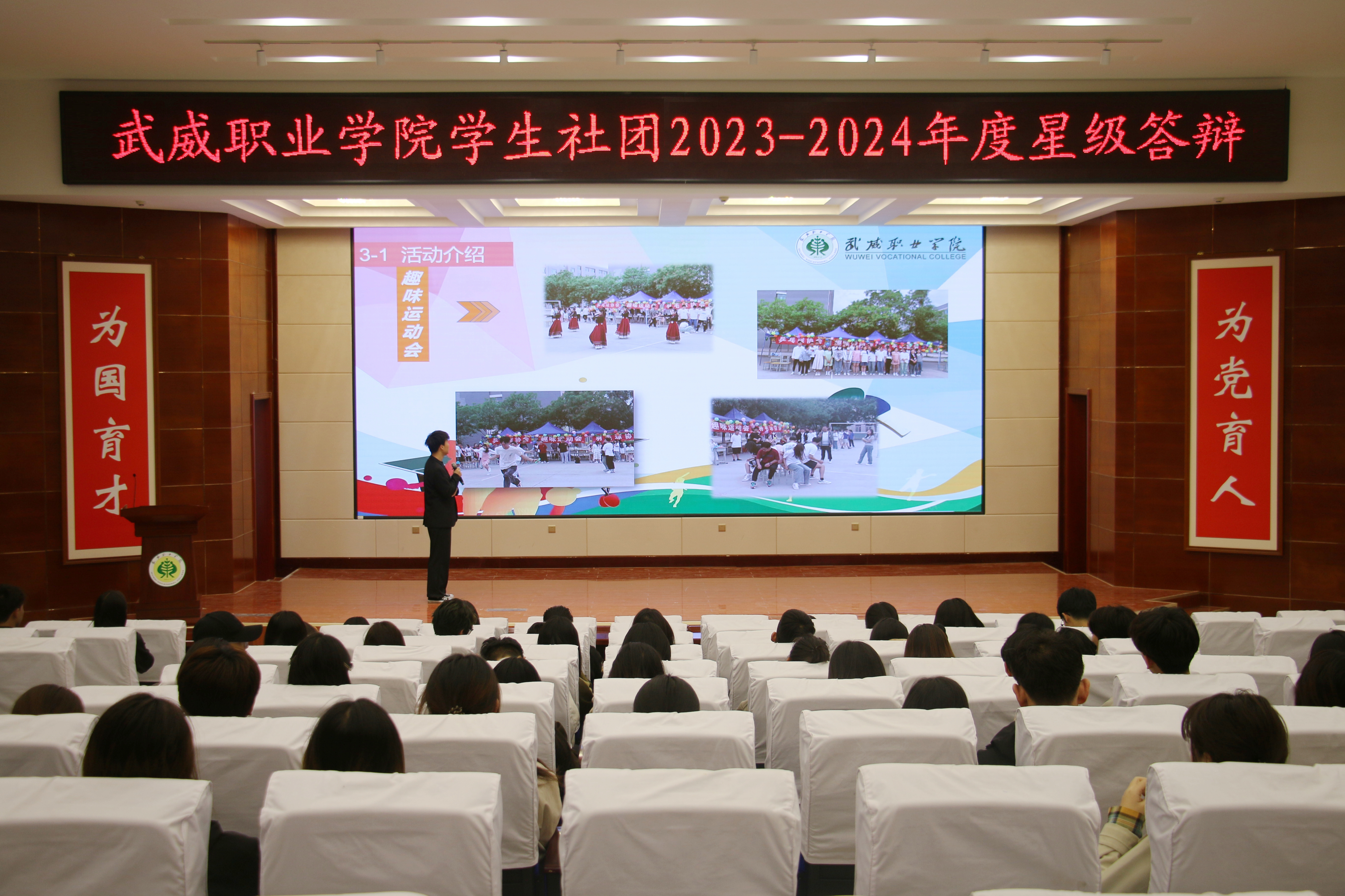 4月12日,學(xué)校在菁英廳舉辦了2023年度學(xué)生社團(tuán)星級(jí)答辯會(huì)。答辯現(xiàn)場(chǎng),各學(xué)生社團(tuán)負(fù)責(zé)人通過(guò)PPT介紹了從基本情況、活動(dòng)開(kāi)展、品牌創(chuàng)新以及未來(lái)規(guī)劃等方面進(jìn)行答辯展示。其中,新思想學(xué)習(xí)社、大學(xué)生攻鼓子藝術(shù)團(tuán)等思想引領(lǐng)類社團(tuán)展示了文化沙龍、藝術(shù)展演等活動(dòng)情況;藍(lán)天愛(ài)心協(xié)會(huì)、大學(xué)生就業(yè)創(chuàng)業(yè)促進(jìn)會(huì)等素質(zhì)拓展型社團(tuán)展示了愛(ài)心幫扶、就業(yè)創(chuàng)業(yè)等活動(dòng);青春健康同伴社、心翼心理協(xié)會(huì)等健康類社團(tuán)展示了健康防艾、心理咨詢等特色活動(dòng);朝陽(yáng)武術(shù)協(xié)會(huì)、羽毛球協(xié)會(huì)、乒乓球協(xié)會(huì)等體育競(jìng)技類社團(tuán)展示了促進(jìn)大學(xué)生健康和興趣培養(yǎng)方面的體育文化活動(dòng)。最后,通過(guò)現(xiàn)場(chǎng)答辯、審核資料、社團(tuán)互評(píng)等方面綜合考量,評(píng)選出五星級(jí)學(xué)生社團(tuán)2個(gè),四星級(jí)學(xué)生社團(tuán)4個(gè),三星級(jí)社團(tuán)6個(gè)。