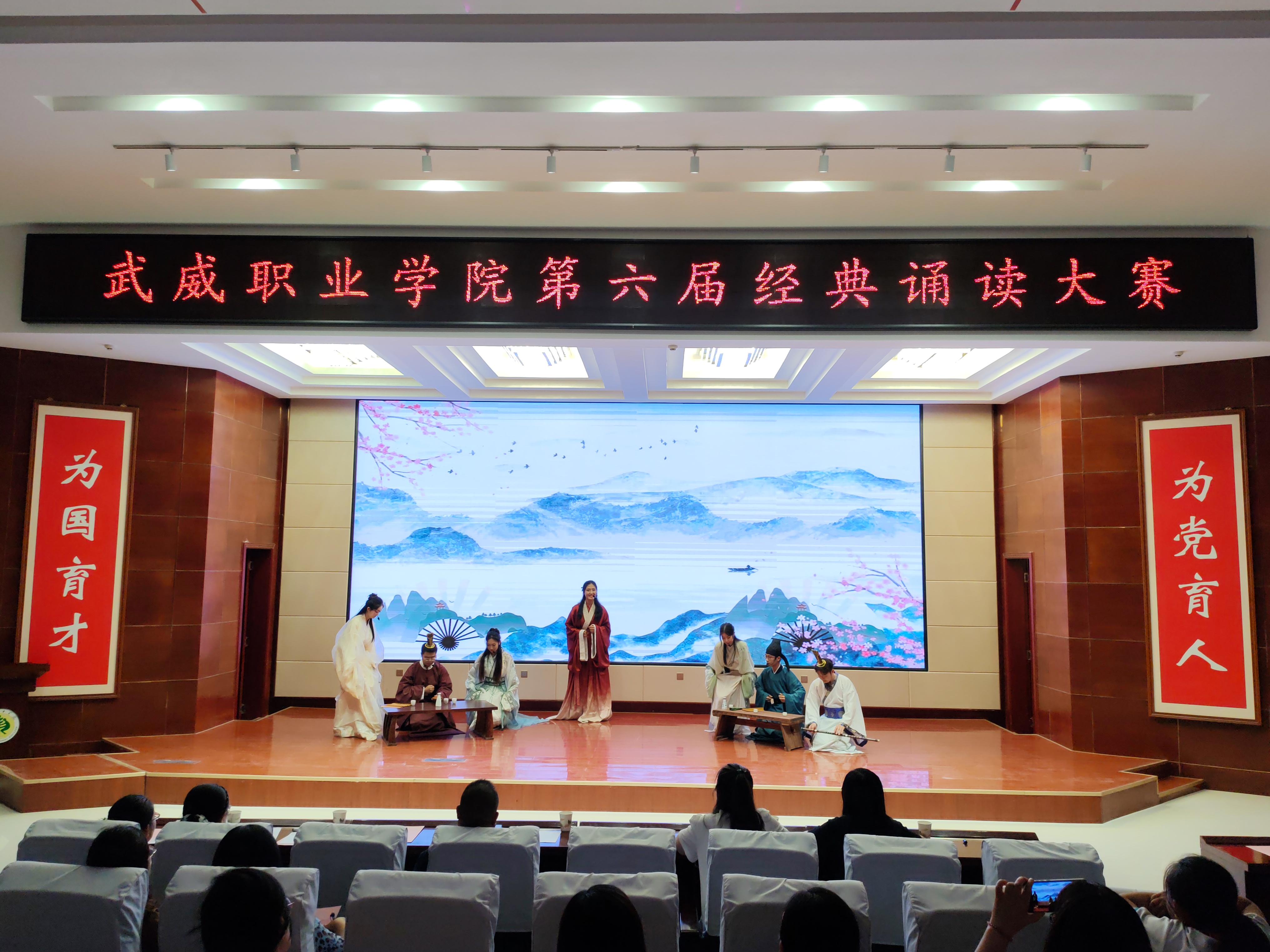 為深化全民閱讀活動(dòng)開(kāi)展,引領(lǐng)社會(huì)大眾親近中華經(jīng)典,傳承弘揚(yáng)中華優(yōu)秀文化,齊心共書(shū)強(qiáng)國(guó)新篇章,武威職業(yè)學(xué)院第六屆經(jīng)典誦讀大賽于6月4日在菁英廳成功舉辦。黨委委員、副校長(zhǎng)田迎春,科研處處長(zhǎng)蔡柱山出席比賽現(xiàn)場(chǎng),邀請(qǐng)語(yǔ)言文字專業(yè)5位評(píng)委為教師組、學(xué)生組、留學(xué)生組共20件參賽作品進(jìn)行現(xiàn)場(chǎng)評(píng)分。