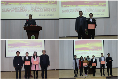 為紀(jì)念紅軍長(zhǎng)征勝利80周年,激發(fā)師生弘揚(yáng)偉大的長(zhǎng)征精神,同時(shí)為豐富校園文化生活,展示青春正能量,藥學(xué)系團(tuán)總支依據(jù)院團(tuán)委的通知精神和系團(tuán)學(xué)工作委員會(huì)關(guān)于增加學(xué)生課余活動(dòng)的會(huì)議要求,于10月30日在正德廳組織開(kāi)展了“傳承長(zhǎng)征精神,筑我青春夢(mèng)想”主題演講比賽。藥學(xué)系主任魏潤(rùn)明出席了本次活動(dòng),各班班主任擔(dān)任本次比賽評(píng)委,2016級(jí)全體學(xué)生和2015級(jí)各班學(xué)生代表觀看了比賽。