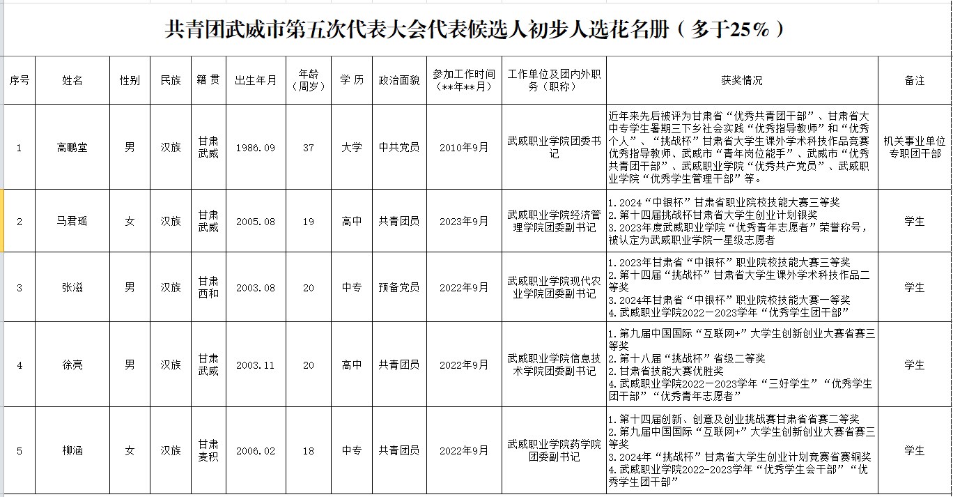 綜合考察結(jié)果及初步人選25%差額比例要求,經(jīng)武威職業(yè)學(xué)院團(tuán)委研究,并報請學(xué)校黨委同意,擬定高鵬堂等5名同志為共青團(tuán)武威市第五次代表大會代表候選人初步人選,現(xiàn)予以公示。