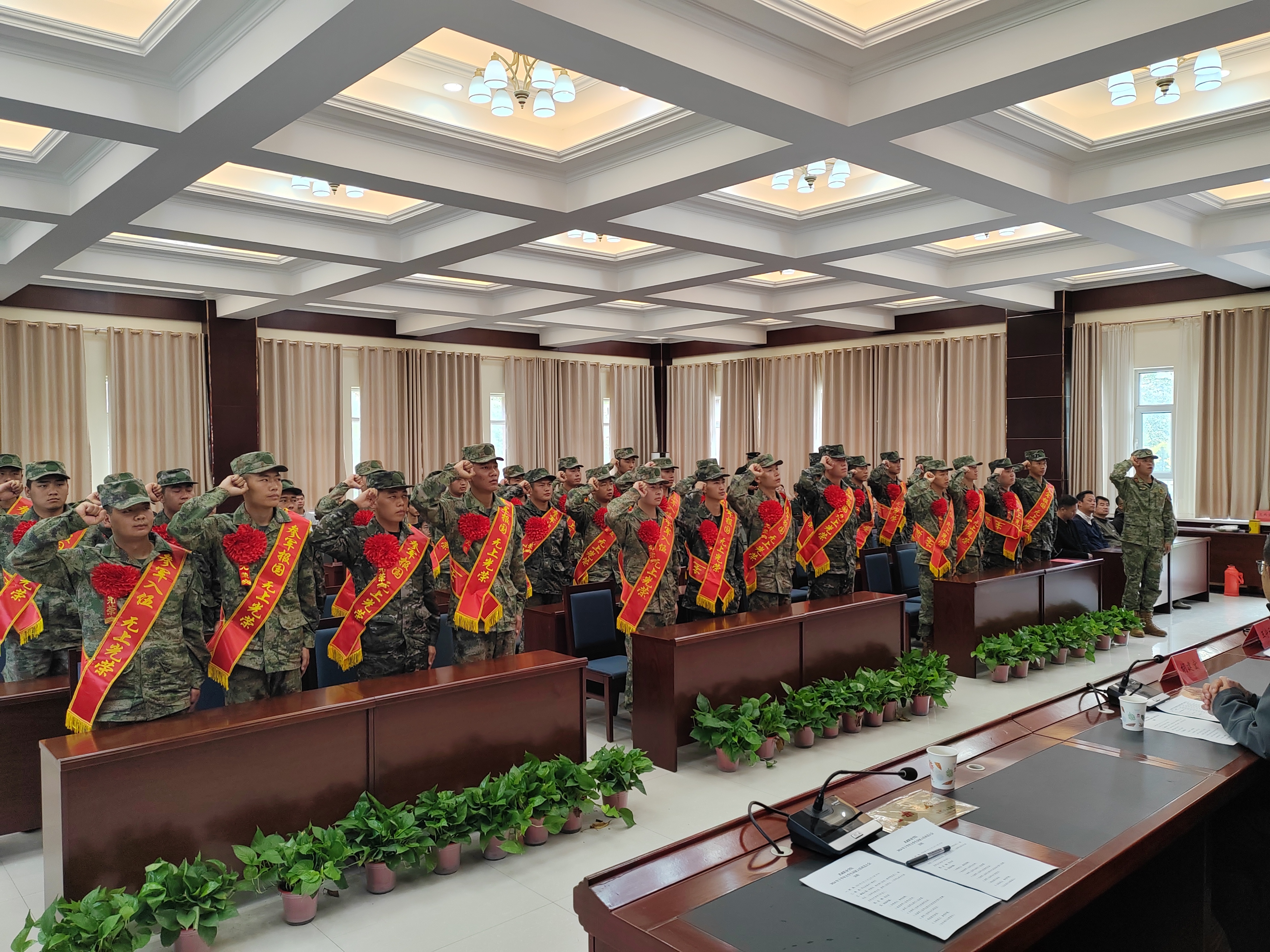 歡送大會上,入伍學(xué)生在退伍復(fù)學(xué)大學(xué)生代表的帶領(lǐng)下進行了鏗鏘有力的入伍宣誓,參會領(lǐng)導(dǎo)向?qū)W校所在地入伍的30名新兵佩戴大紅花并贈送紀念品,為入伍學(xué)生家長代表頒發(fā)“光榮之家”光榮牌。