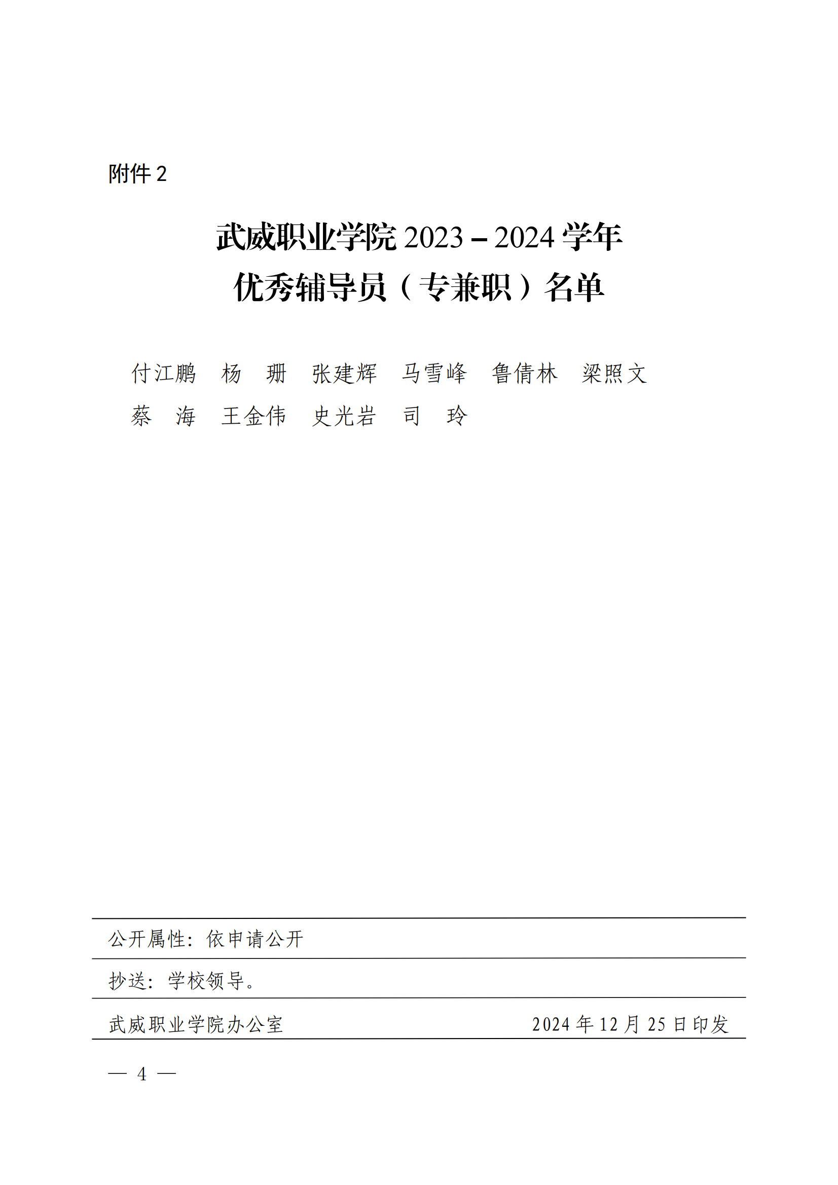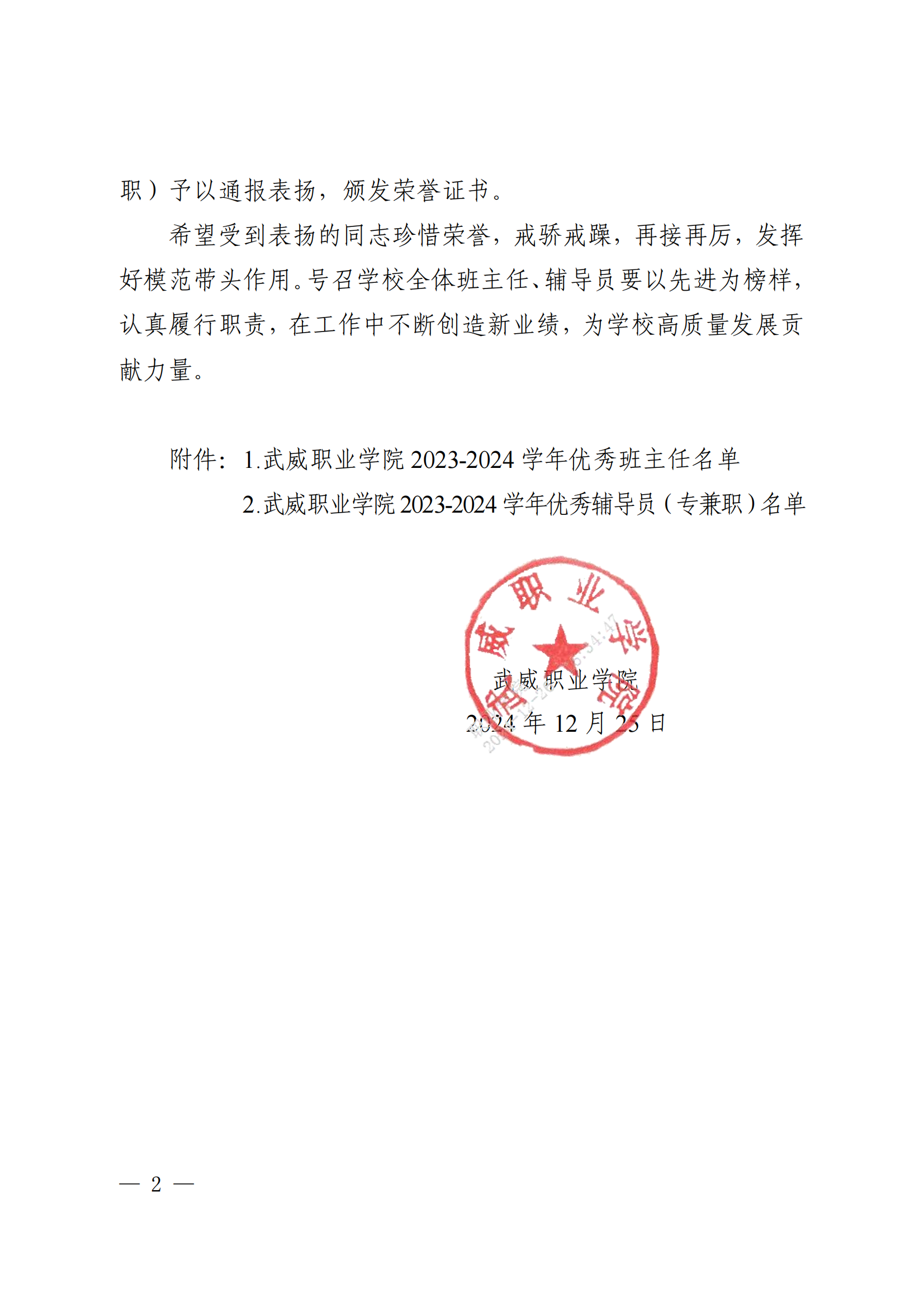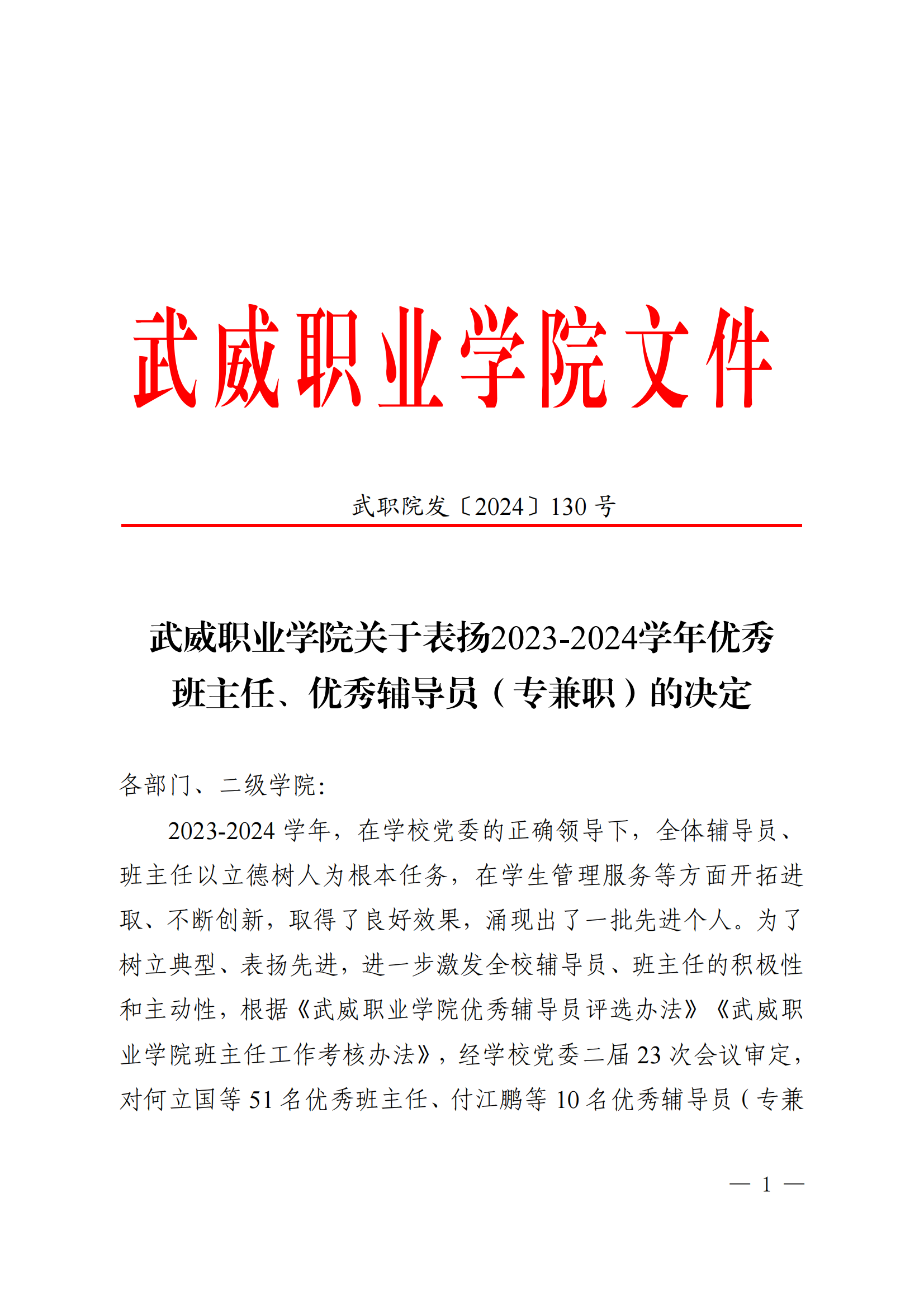 武威職業(yè)學院關于表揚2023-2024學年優(yōu)秀班主任、優(yōu)秀輔導員(專兼職)的決定