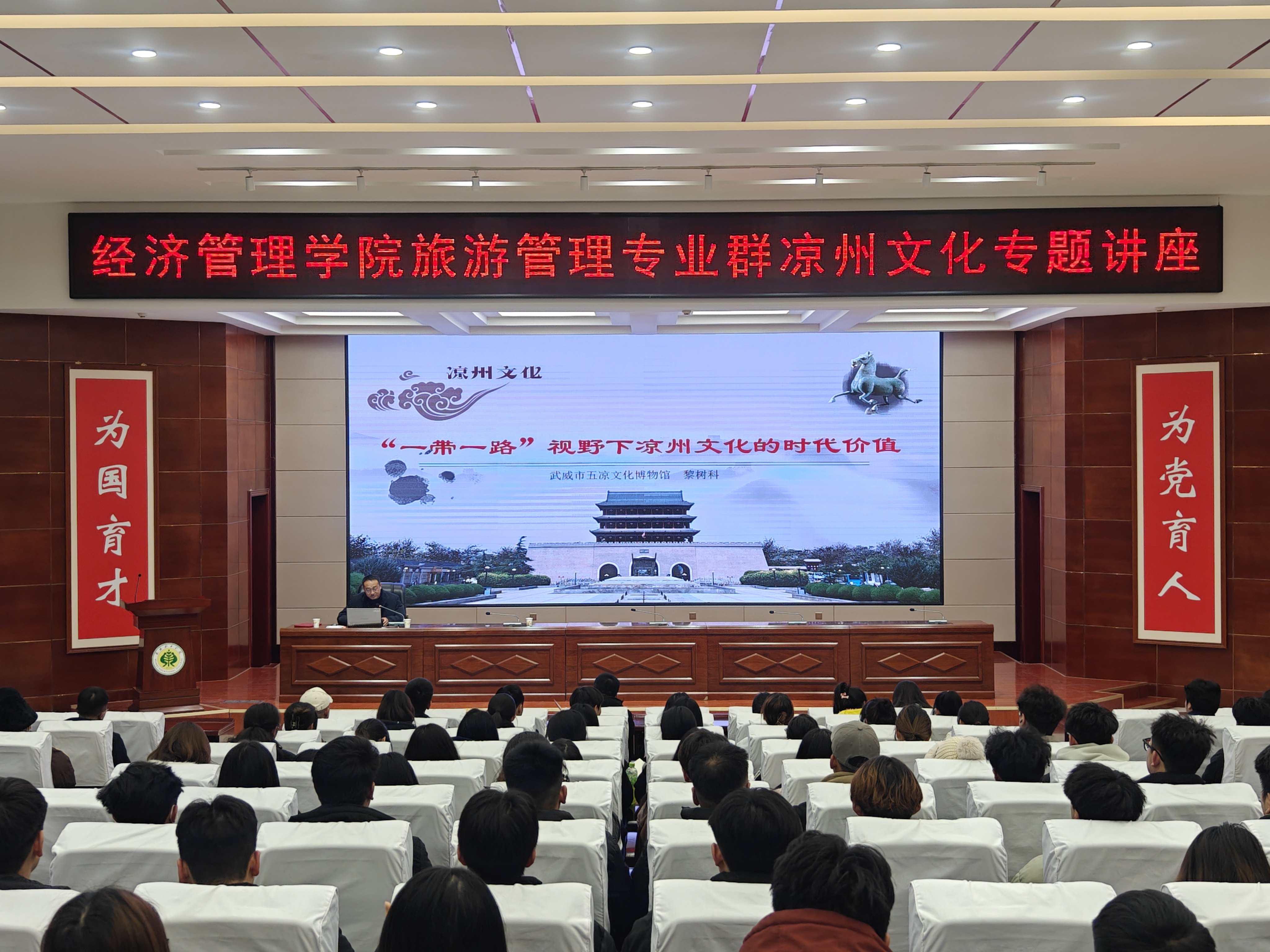 ? ? 12月11日下午,經(jīng)濟管理學(xué)院邀請武威市五涼文化博物館館長黎樹科開展了以《“一帶一路” 視野下涼州文化的時代價值》為主題的講座,旨在深入貫徹文化傳承發(fā)展戰(zhàn)略,加強傳統(tǒng)文化的弘揚與教育。學(xué)院近200名師生參加此次講座。