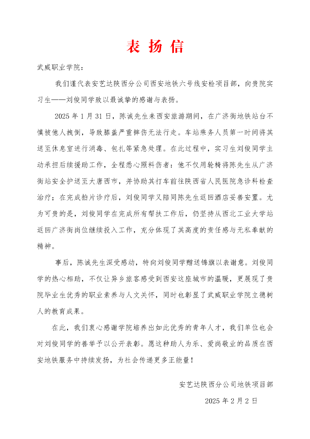 近日,武威職業(yè)學院計算機應用技術專業(yè)2025屆畢業(yè)生劉俊在西安地鐵實習期間,主動救助因突發(fā)意外受傷的乘客,展現(xiàn)了當代青年學子的責任擔當。其事跡獲得被救助乘客及實習單位的高度評價,乘客陳先生向劉俊同學贈送錦旗以表謝意,實習單位安藝達陜西分公司地鐵項目部特向學校發(fā)來表揚信,稱贊其“以行動詮釋服務精神,用愛心彰顯職業(yè)素養(yǎng)”。