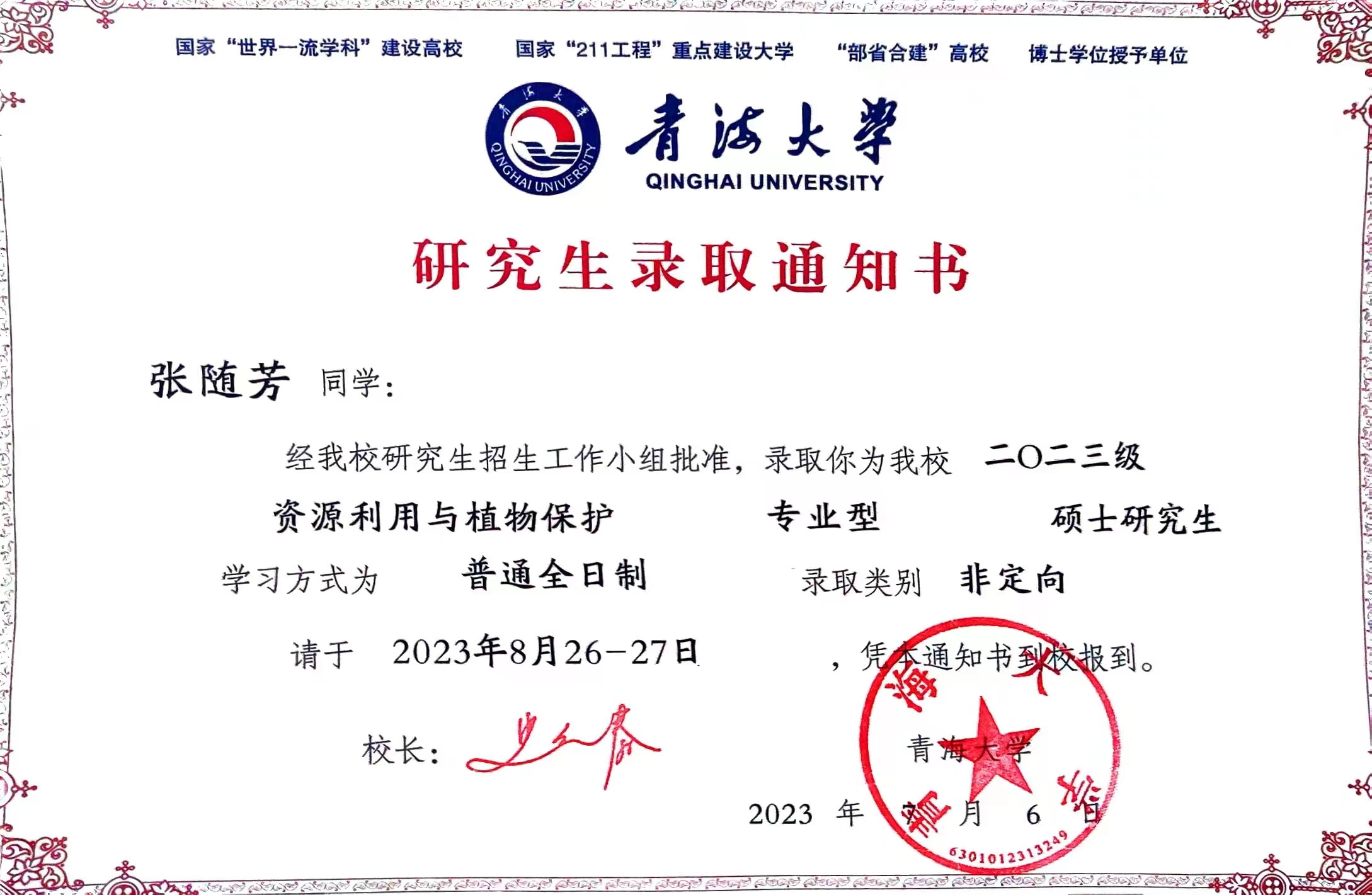 張隨芳,2018級植物保護與檢疫技術大專班,2021年考取河西學院農學本科專業(yè),2023年考取青海大學資源利用與植物保護專業(yè)碩士研究生。