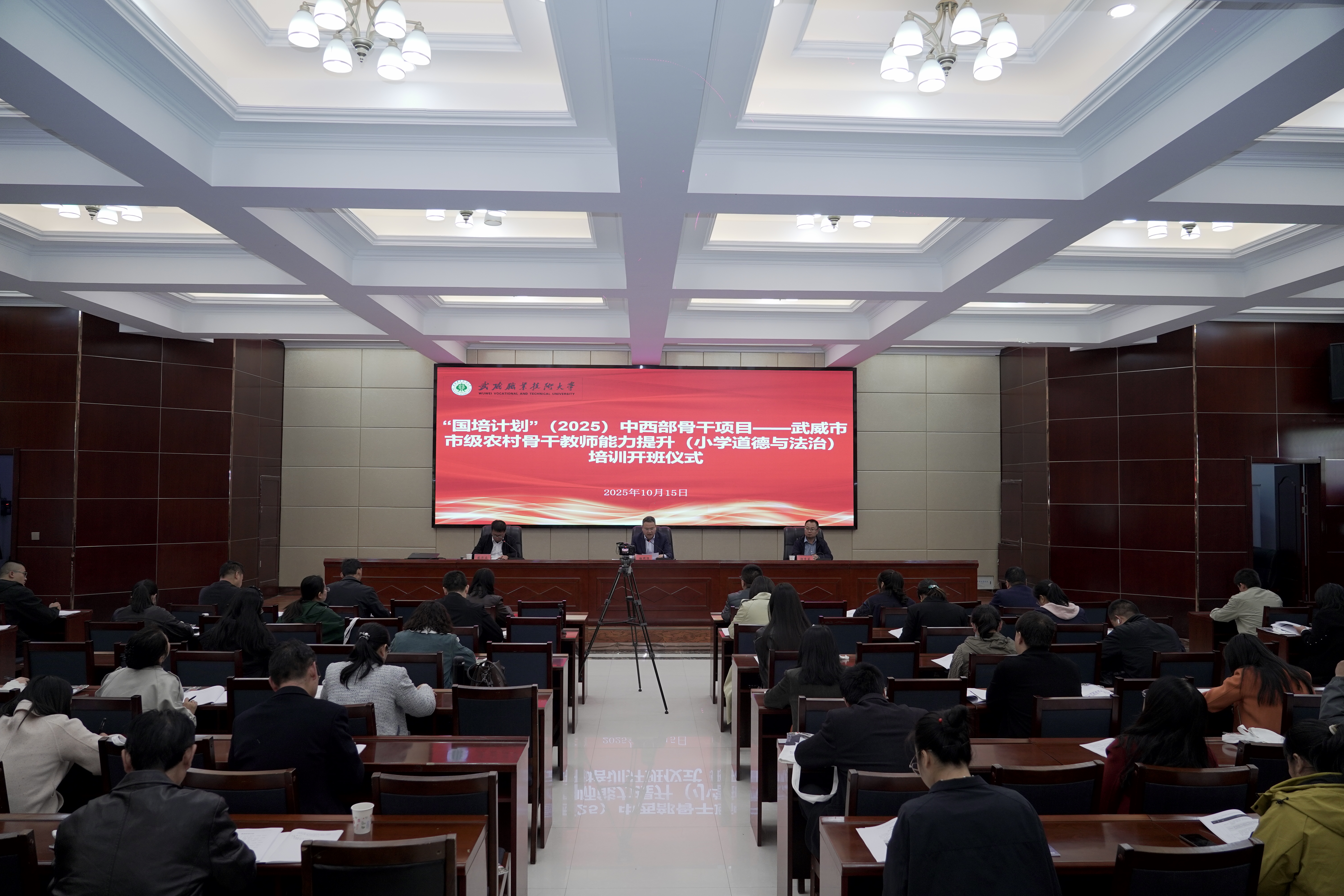 10月15日,由武威市教育局主辦、武威職業(yè)技術(shù)大學(xué)承辦的“國培計劃”(2025)中西部骨干項目——武威市市級農(nóng)村骨干教師能力提升(小學(xué)道德與法治)培訓(xùn)班在學(xué)校行樹樓北側(cè)報告廳正式開班。學(xué)校黨委委員、副校長伍國強出席開班儀式。培訓(xùn)組織管理工作人員及60名參訓(xùn)骨干教師共同參加。開班儀式由學(xué)校國際合作交流處副處長蔡濟(jì)眾主持。