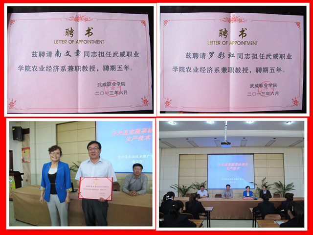 實(shí)訓(xùn)工作開幕式上,農(nóng)業(yè)經(jīng)濟(jì)系聘請(qǐng)武威市涼州區(qū)農(nóng)技推廣中心高級(jí)農(nóng)藝師南文章和羅彩虹同志為武威職業(yè)學(xué)院農(nóng)業(yè)經(jīng)濟(jì)系兼職教授。南文章教授為全體師生做了題為《日光溫室蔬菜標(biāo)準(zhǔn)化生產(chǎn)技術(shù)》的專題講座。
