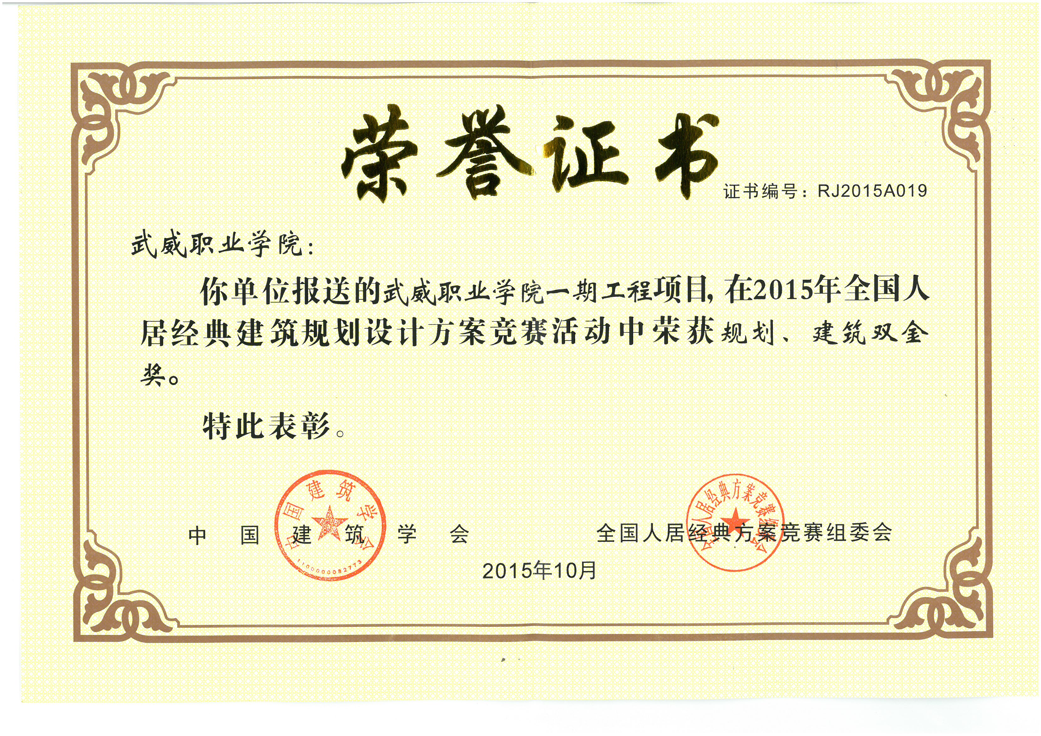 2015年10月,第十五屆全國人居經(jīng)典建筑規(guī)劃設計方案競賽結果在北京揭曉,我院報送的武威職業(yè)學院一期擴建項目在全國眾多參賽項目中脫穎而出,榮膺規(guī)劃、建筑雙金獎。全國人居經(jīng)典方案競賽由中國建筑學會主辦,全國人居經(jīng)典方案競賽組委會承辦,自2001年起每年舉辦一屆,參賽項目覆蓋全國所有省份及港澳臺地區(qū),評審專家皆為業(yè)界權威,獲獎難度大,權威性高。榮膺規(guī)劃、建筑雙金獎是武威建筑項目上的首次。