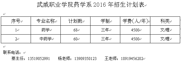武威職業(yè)學(xué)院藥學(xué)系2016年招生計(jì)劃