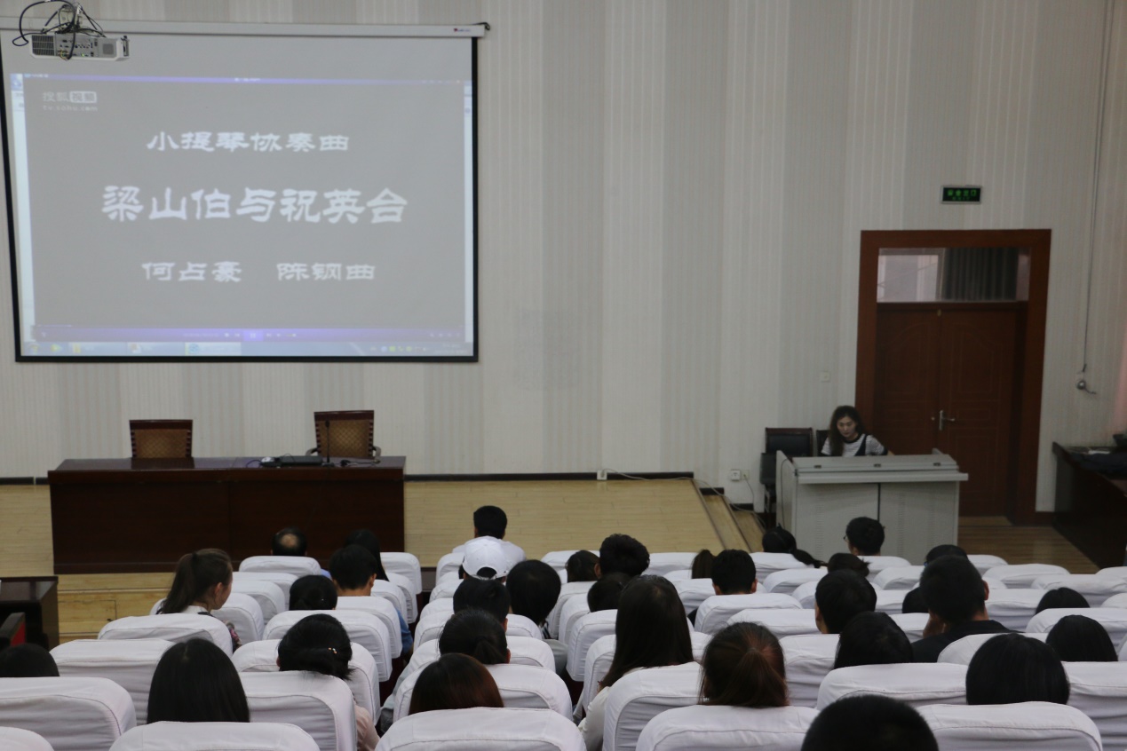 伴著優(yōu)美的音樂旋律王敏副教授開始了講座,王老師首先介紹了音樂發(fā)展歷史和音樂鑒賞的基礎知識,然后以我國著名作曲家陳鋼、何占豪先生創(chuàng)作的小提琴協(xié)奏曲《梁山伯與祝英臺》為題材,分階段講述了“鳥語花香”、“草橋結拜”、“英臺抗婚”、“投墳化蝶”等內(nèi)容和藝術場景。剖析了作品在管樂、和以小提琴、大提琴為主的弦樂及民樂有機結合的高超藝術境界,講座過程中王老師結合《梁祝》協(xié)奏曲音視頻資料,演繹了梁山伯與祝英臺凄美的愛情故事。