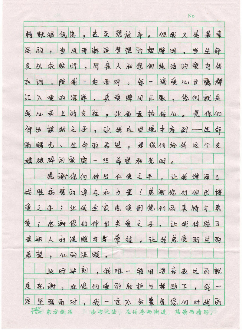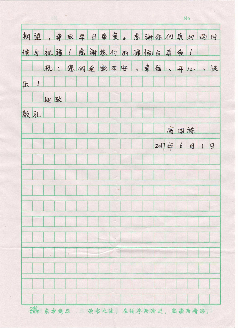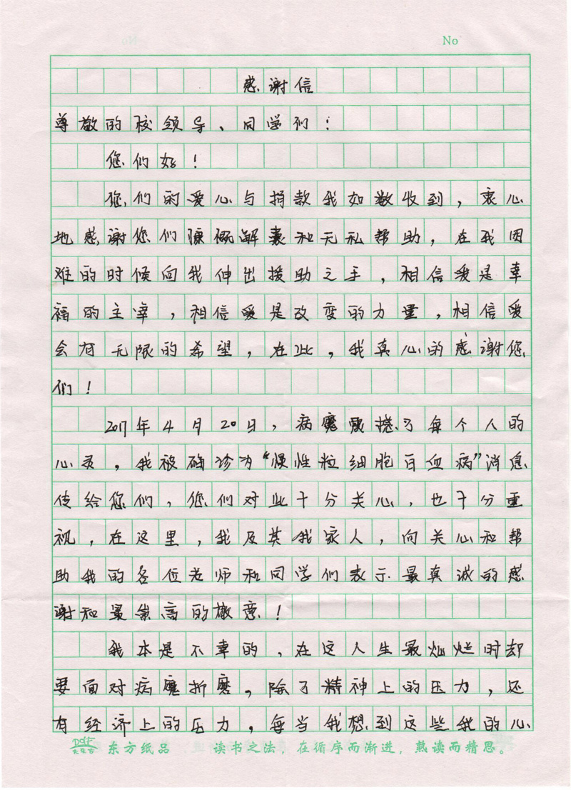 高國棟是我院機(jī)械制造系2015級機(jī)械設(shè)計(jì)與制造大專班學(xué)生,于2017年4月確診為慢性粒細(xì)胞白血病。得知這一特殊情況后,學(xué)院宣傳統(tǒng)戰(zhàn)部、團(tuán)委、學(xué)生工作處第一時間向全院廣大師生發(fā)出倡議,號召大家獻(xiàn)出愛心,幫助高國棟同學(xué)度過難關(guān)。學(xué)院廣大師生紛紛解囊,慷慨相助。目前捐助的善款已經(jīng)交給高國棟同學(xué)。為此,高國棟同學(xué)特意寫來感謝信,表達(dá)對母校廣大師生的感激之情。在此,我們衷心祝愿高國棟同學(xué)能在困境中迎難而上,樹立戰(zhàn)勝疾病的信心,爭取早日康復(fù),重返校園。
