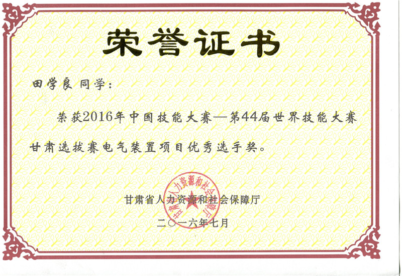 2016年中國技能大賽甘肅選拔賽電氣裝置項目優(yōu)秀獎