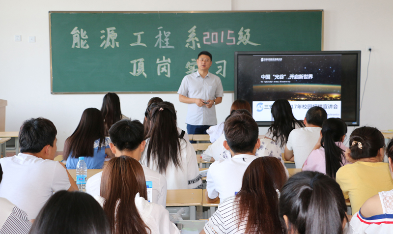 安徽三安光電有限公司在行樹樓504教室開展了頂崗實(shí)習(xí)宣講會,2015級農(nóng)村能源與環(huán)境技術(shù)大專班和2015級太陽能光熱技術(shù)及應(yīng)用大專班學(xué)生參加了此次宣講會。李明經(jīng)理就企業(yè)概況、企業(yè)文化、崗位需求、薪酬待遇等方面向同學(xué)們做了介紹,并對有應(yīng)聘意向的同學(xué)進(jìn)行了面試,最終共有50人被安徽三安光電有限公司錄用。