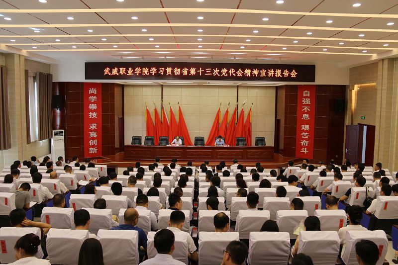 張國(guó)民強(qiáng)調(diào),學(xué)院要把學(xué)習(xí)好、宣傳好、貫徹落實(shí)好省第十三次黨代會(huì)精神作為當(dāng)前首要的政治任務(wù)。廣大黨員和干部師生要努力提高政治站位,切實(shí)把思想和行動(dòng)統(tǒng)一到省第十三次黨代會(huì)的決策部署上來,把黨代會(huì)精神轉(zhuǎn)化為推動(dòng)學(xué)院改革發(fā)展的強(qiáng)大動(dòng)力;學(xué)院各級(jí)黨組織要以此次宣講為契機(jī),在前一階段學(xué)習(xí)的基礎(chǔ)上,繼續(xù)通過集中學(xué)習(xí)、集中輪訓(xùn)、集體研討、舉辦報(bào)告會(huì)等多種形式, 開展深入系統(tǒng)的學(xué)習(xí)研討,營(yíng)造學(xué)習(xí)宣傳貫徹黨代會(huì)精神的濃厚氛圍;要把學(xué)習(xí)貫徹省第十三次黨代會(huì)精神與學(xué)習(xí)貫徹習(xí)近平總書記系列重要講話精神、黨的十八屆六中全會(huì)精神、全國(guó)高校思想政治工作會(huì)議精神和即將召開的黨的十九大精神緊密結(jié)合起來,統(tǒng)籌謀劃,同步推進(jìn);要把學(xué)習(xí)宣傳貫徹省第十三次黨代會(huì)精神與學(xué)院“兩學(xué)一做”學(xué)習(xí)教育常態(tài)化制度化、“三比兩促”主題活動(dòng)、貫徹落實(shí)學(xué)院第一次黨代會(huì)精神、學(xué)院“十三五”發(fā)展規(guī)劃、創(chuàng)建甘肅省優(yōu)質(zhì)高等職業(yè)院校和實(shí)現(xiàn)一流高職院校發(fā)展目標(biāo)緊密結(jié)合起來,靠實(shí)工作責(zé)任,真抓實(shí)干,使學(xué)院在辦學(xué)質(zhì)量、產(chǎn)教融合、招生就業(yè)、服務(wù)社會(huì)等方面全面提升,為全省教育精準(zhǔn)扶貧和建設(shè)幸福美好新甘肅貢獻(xiàn)智慧和力量,以優(yōu)異的成績(jī)迎接黨的十九大勝利召開。