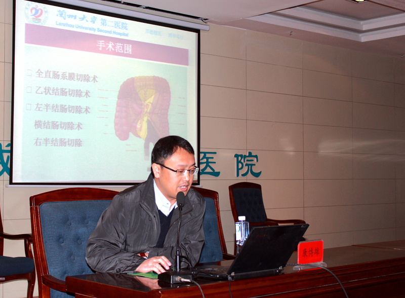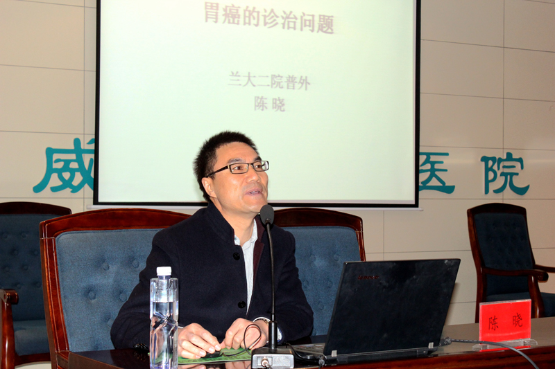 醫(yī)院邀請到蘭州大學第二醫(yī)院普外三科主任、胃腸外科主任、主任醫(yī)師陳曉和普外二科副主任,副主任醫(yī)師康博雄為大家作學術(shù)講座。陳曉主講了《胃癌的診治問題》,并與大家分享了他在法國醫(yī)院和美國醫(yī)院進修學習時的一些感想和見聞。陳曉在講座中結(jié)合臨床體會說:許多胃癌患者在就診時已經(jīng)發(fā)展為中晚期,失去了手術(shù)機會。他呼吁全社會要認識到對胃癌高發(fā)地區(qū)、高危年齡、高危人群進行篩查的必要性。醫(yī)生要對有癥狀的患者及早進行胃鏡檢查,爭取做到早發(fā)現(xiàn)、早診斷、早治療。講座中,陳曉就外科手術(shù)吻合方式選擇與直屬附屬醫(yī)院外科主任滕志勇醫(yī)生進行了現(xiàn)場互動。