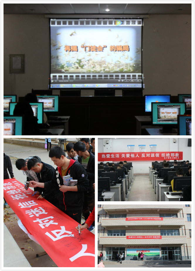 為了建設(shè)和諧校園,維護(hù)社會(huì)穩(wěn)定,凈化教育系統(tǒng)校園,電子信息工程于10月30日晚,在尚德樓11號機(jī)房開展了反邪教宣傳片放映活動(dòng)。