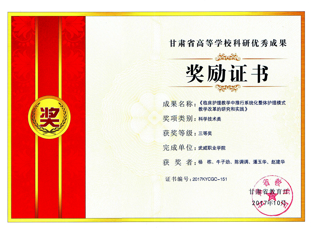 2017年度甘肅省高等學??蒲袃?yōu)秀成果獎勵證書
