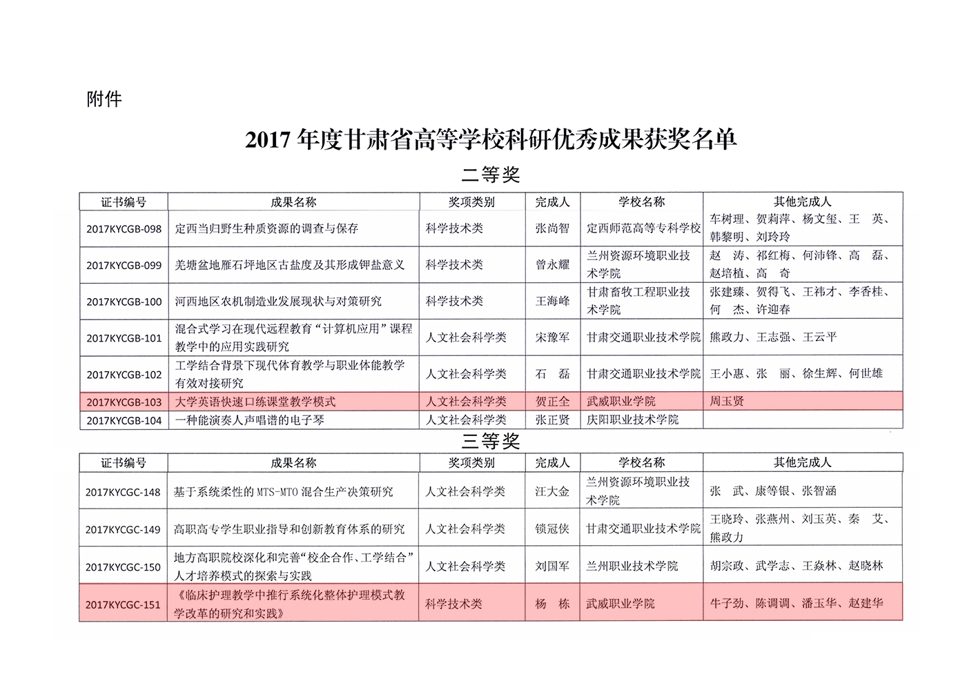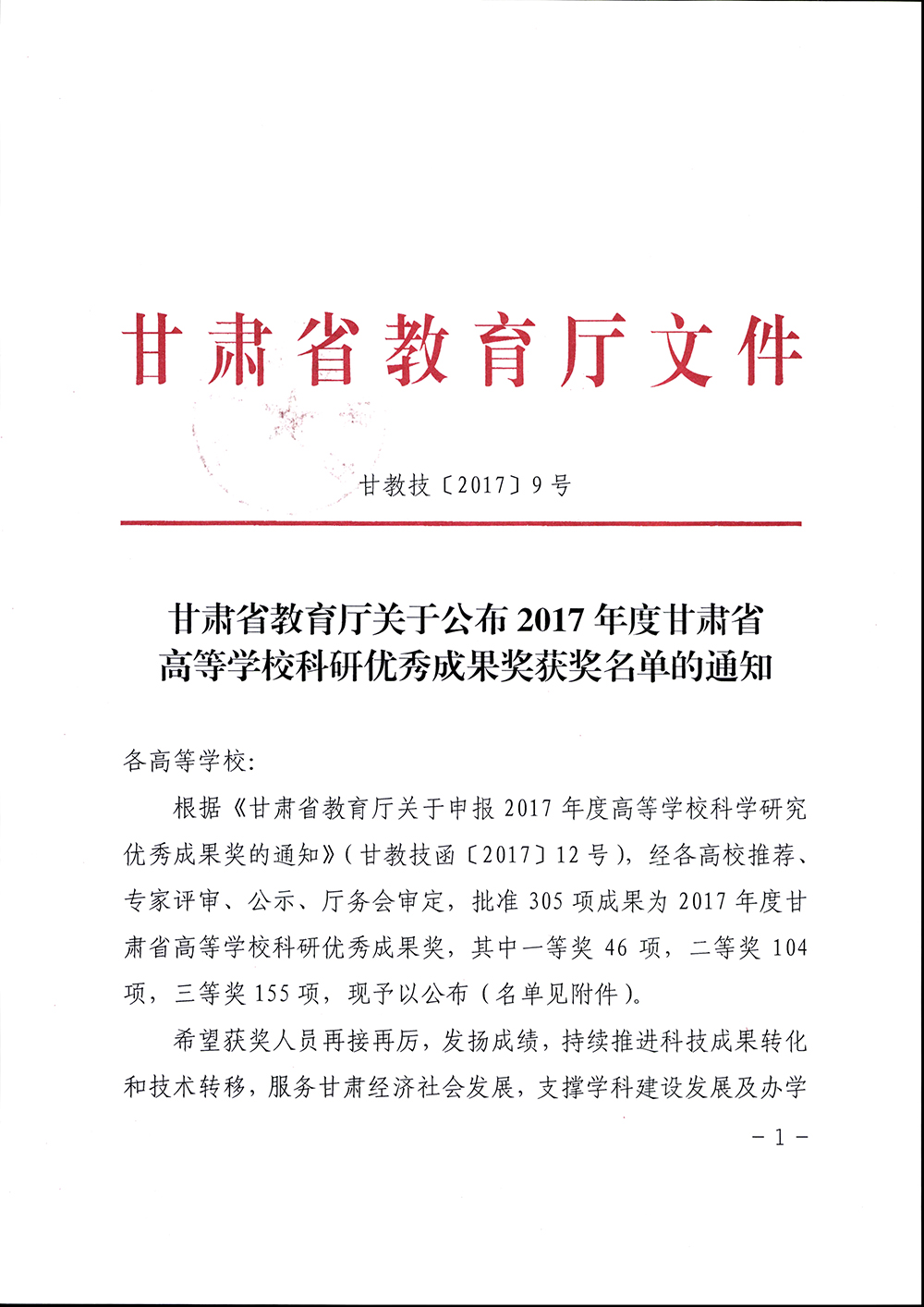 轉(zhuǎn)發(fā)甘肅省教育廳關(guān)于公布2017年度甘肅省高等學(xué)校科研優(yōu)秀成果獎獲獎名單的通知