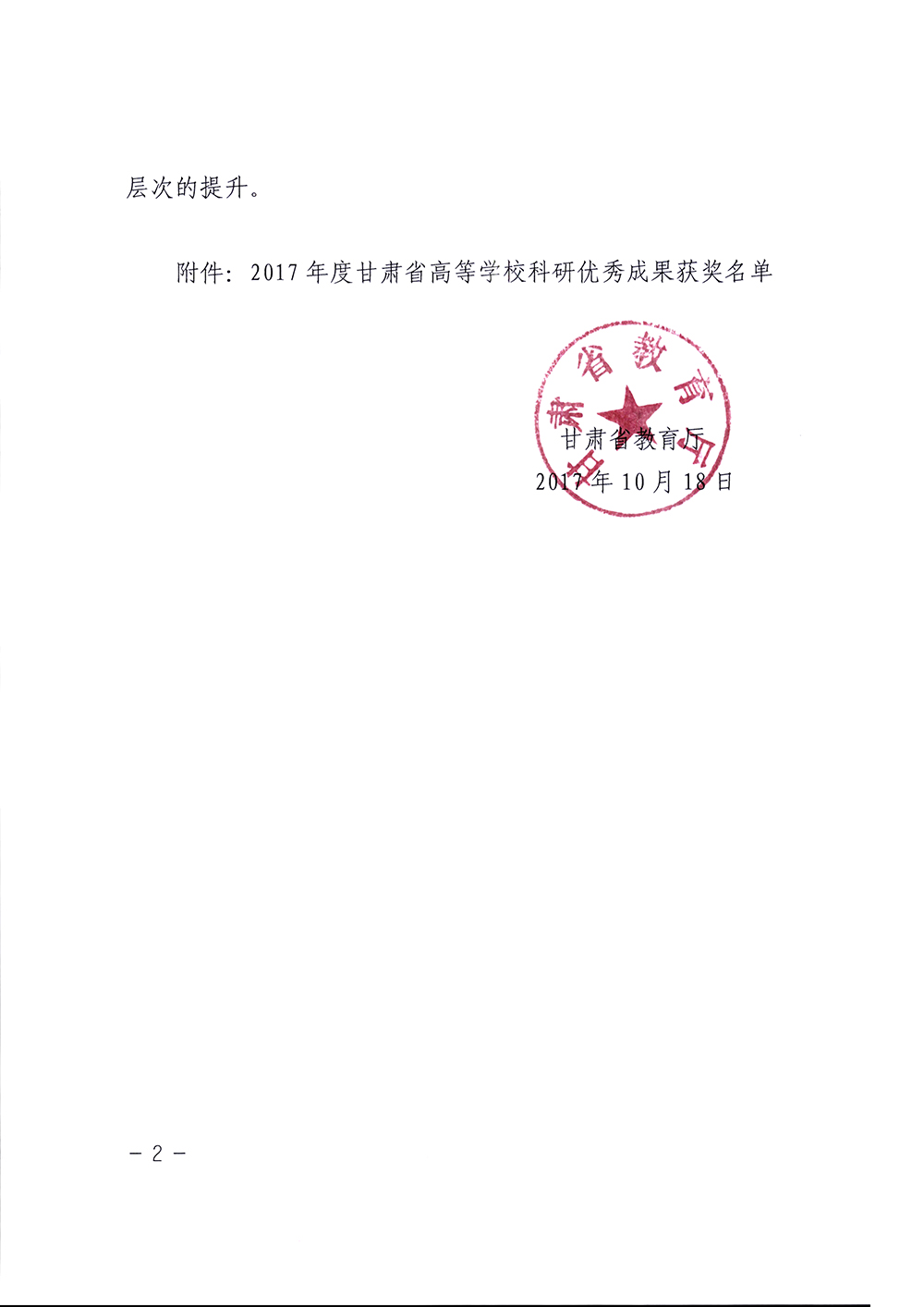 2017年度甘肅省高等學(xué)校科研優(yōu)秀成果獎勵證書