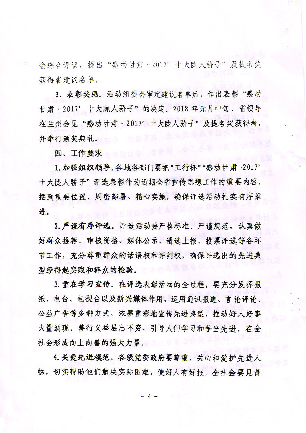 2.推薦對象必須按照《中共甘肅省委宣傳部〈關(guān)于做好‘工行杯’感動甘肅·2017十大隴人驕子候選人推薦工作的通知》中的推薦條件確定。