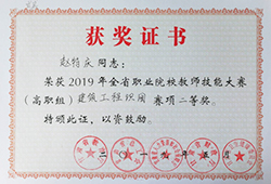 項(xiàng)目組成員趙特慶2019年5月榮獲2019年全省職業(yè)院校教師技能大賽(高職組)建筑工程識圖賽項(xiàng)二等獎