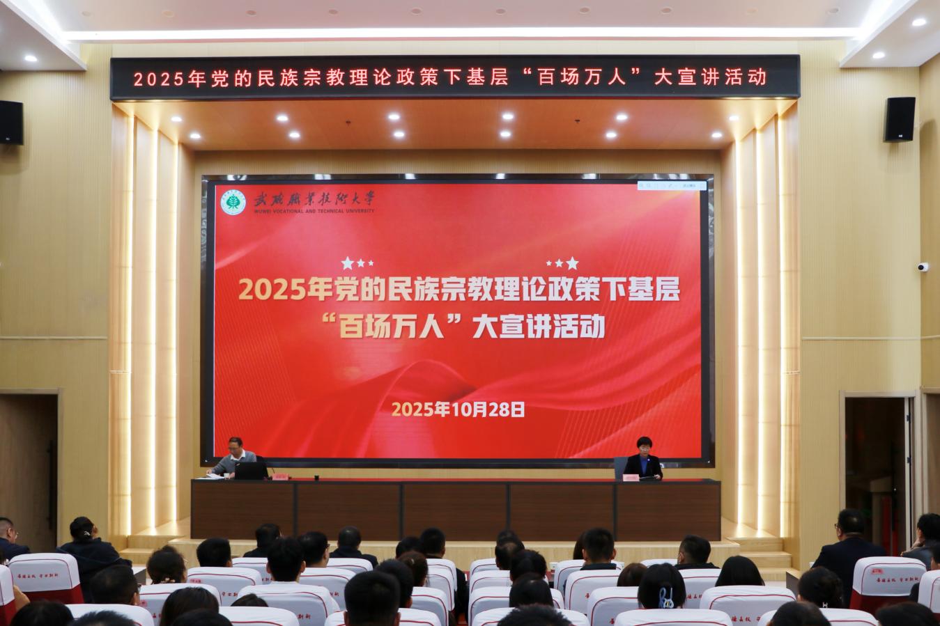10月28日,2025年黨的民族宗教理論政策下基層“百場萬人”大宣講活動在武威職業(yè)技術大學成功舉行?;顒犹匮拭C農(nóng)業(yè)大學黨委統(tǒng)戰(zhàn)部常務副部長唐致剛作專題宣講,學校黨委理論學習中心組成員、中層干部、輔導員、班主任共110人聆聽了講座。
